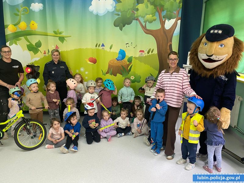 Policjantka z Komendy Powiatowej Policji w Lubinie odwiedziła dzieci z Przedszkola Miejskiego nr 1. Podczas przeprowadzonej lekcji najmłodsi usłyszeli o zasadach bezpieczeństwa, a następnie z policjantką przećwiczyli poznane zasady, między innymi jak bezpiecznie poruszać się na hulajnodze i rowerze. Całe spotkanie przebiegło w radosnej atmosferze. Szczęśliwe maluchy z uśmiechami na twarzy wróciły do swoich domów, zaopatrzone w bardzo potrzebną wiedzę i pamiątkowymi zdjęciami z ulubioną maskotką – Komisarzem Lwem.